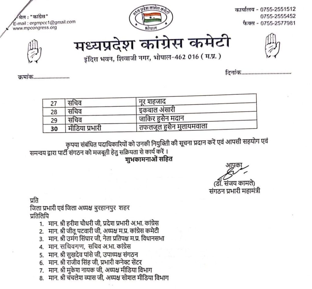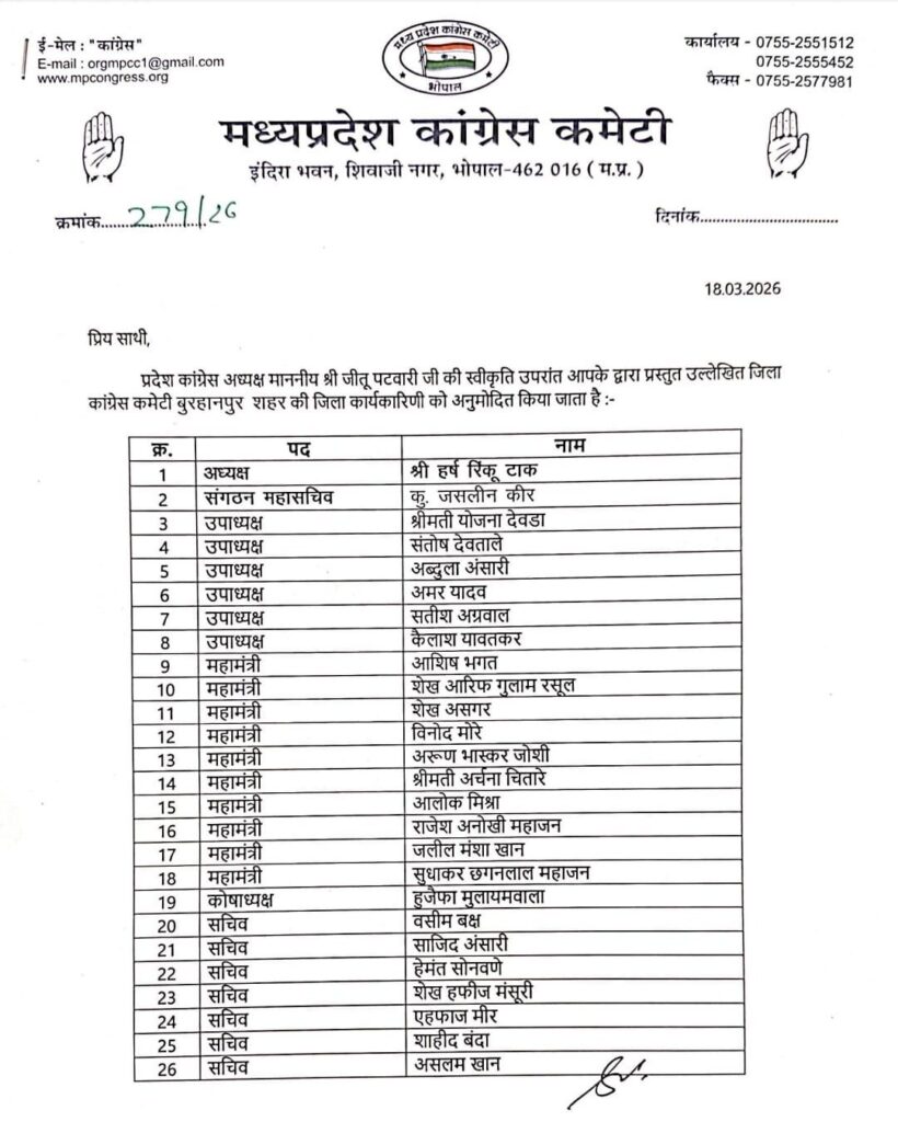 प्रदेश कांग्रेस अध्यक्ष श्री जीतू पटवारी जी के निर्देशानुसार बुरहानपुर शहर की जिला कांग्रेस कार्यकारिणी की नियुक्ति की गई है।