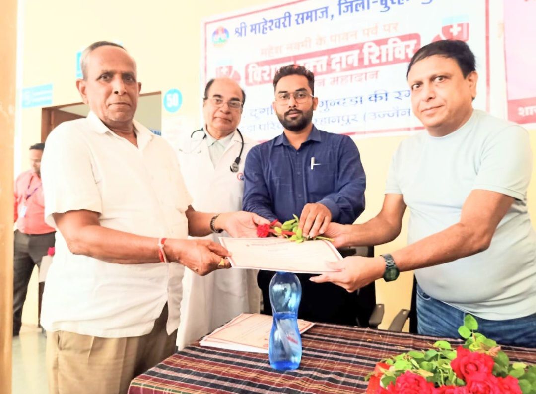 आज दिनांक 14/06/2024 को शासकीय स्व नंदकुमार सिंह चौहान चिकित्सालय बुरहानपुर में विश्व रक्तदान दिवस पर आदरणीय डाक्टर प्रदिप मोसेसcs, डाक्टर भुपेंद्र गौरRmo, डाक्टर आर्यन गढ़वाल डाक्टर हुमायूं डोड रेखा सिस्टर पवन कासोडे एवं अन्य अधिकारी एव कर्मचारियों के उपस्थित मे विश्व रक्तदान दिवस पर सकलपंच बडगुजर समाज को सम्मानित किया गया यह सम्मान प्राप्त करने हेतु समाज के वरिष्ठ मार्गदर्शक श्री रमेश कोटवे ने प्राप्त किया उन्होंने बताया की समाज के अध्यक्ष के जन्मदिन के अवसर पर शिविर ल