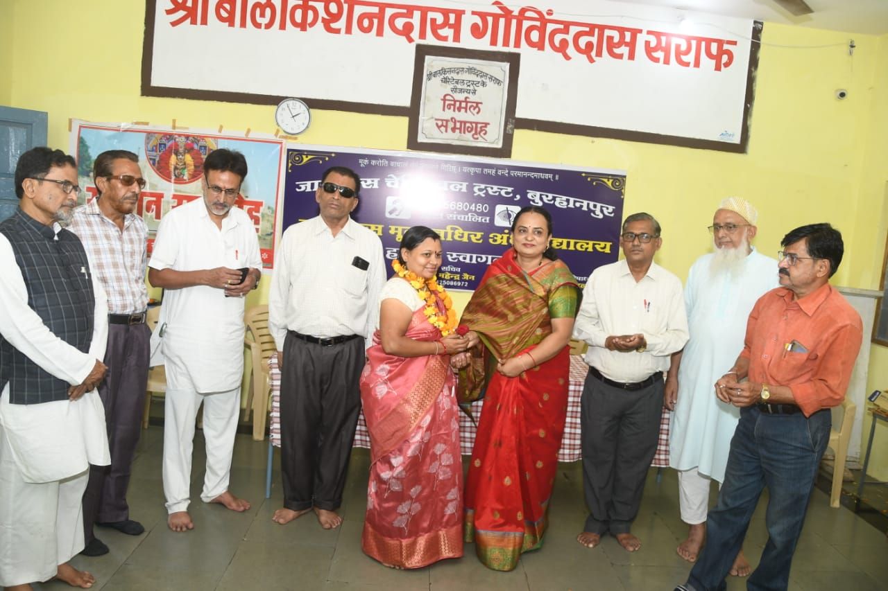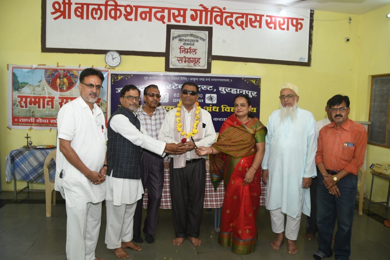 ुरहानपुर – शिक्षक दिवस पर रास्तीपुरा स्थित जिले के एक- मात्र मूक, बधिर एवं अंध विद्यालय के शिक्षकों क़ो ताप्ती सेवा समिति द्वारा सम्मानित किया गया, विद्यालय में विगत तीस वर्षो से सेवारत ब्रेल शिक्षक धर्मेंद्र भंडारी का सम्मान अध्यक्ष श्रीमती सरिता भगत ने शाल श्रीफल, सम्मानपत्र देकर किया.